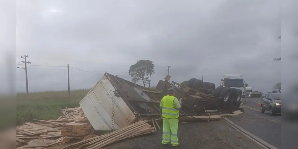 Um caminhão tombou ao trafegar pelo km 213 da PR-092, no sentido de Jaguariaíva à Arapoti, na manhã desta quarta-feira (1).