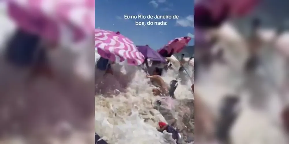 A usuária do TikTok, Fernanda Assis registrou o momento em que as ondas foram tão fortes que chegaram na parte da areia onde as pessoas estavam tomando sol.