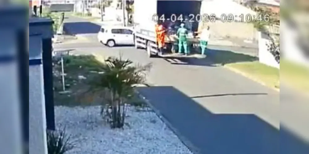 Colisão em cruzamento: Um caminhão de lixo atingiu a lateral de um Fiat Uno no bairro Parque dos Lagos, em Colombo, na manhã deste sábado, após o motorista do carro não notar o veículo maior devido à sinalização apagada.
