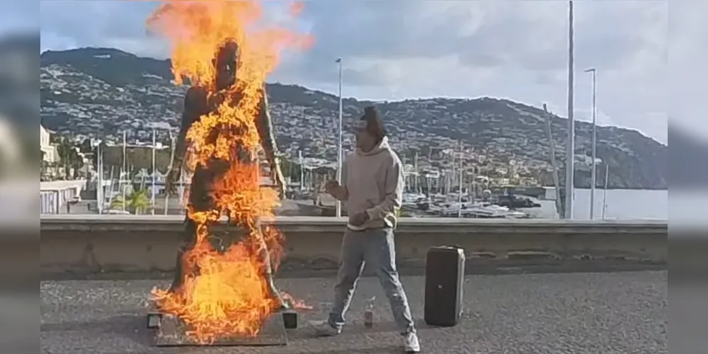 Nas gravações, o homem aparece despejando um líquido inflamável sobre a escultura em tamanho real e, na sequência, ateando fogo. O caso passou a ser tratado como crime pelas autoridades portuguesas. Confira: