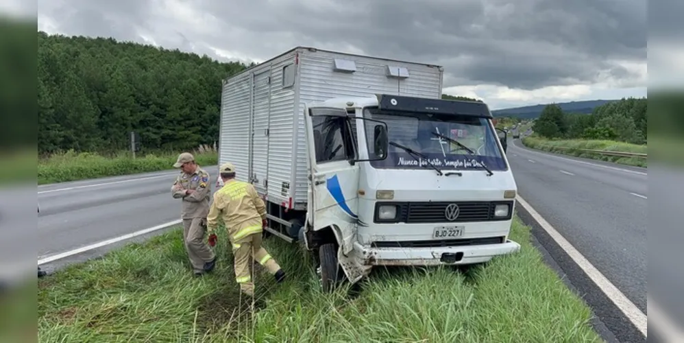 Um caminhão baú saiu da pista e parou no canteiro central do quilômetro 527 da BR-376, próximo ao Parque Vila Velha em Ponta Grossa, na tarde desta terça-feira (23).