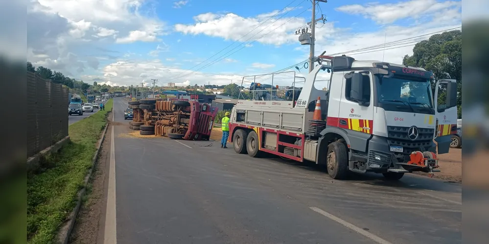 Um caminhão carregado de milho invadiu a pista contrária da BR-376 e tombou na tarde desta segunda-feira (9), na região do bairro Santa Paula, avenida Presidente Kennedy. A pista do sentido Norte da rodovia ficou completamente interditada até a retirada do veículo da via.