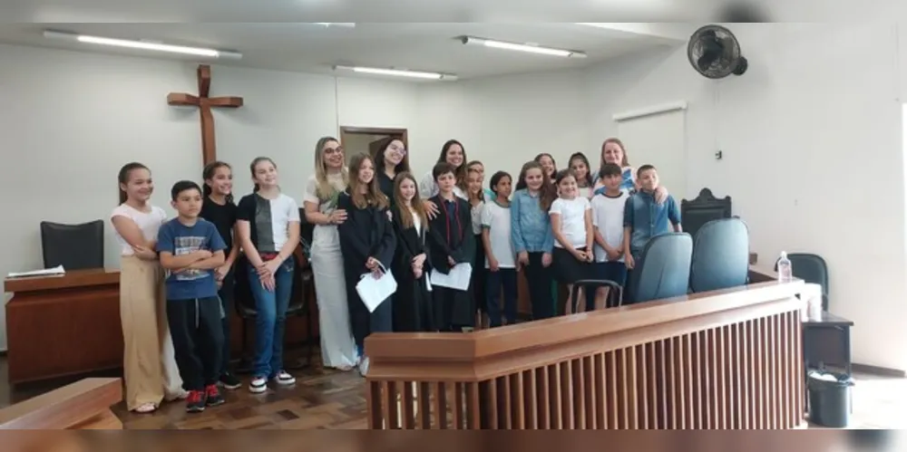Edina cita que as turmas receberam a visita da juíza, da promotora Gabriele, de advogados e da assistente social Egleci Matchula. Na oportunidade, os alunos dirigiram às autoridades algumas dúvidas pertinentes aos artigos da Constituição e função dos convidados presentes, gravados em forma de entrevista. Para complementar, os estudantes realizaram um teatro de júri simulado com o tema ‘Justiça e Cidadania – Discriminação Racial’.