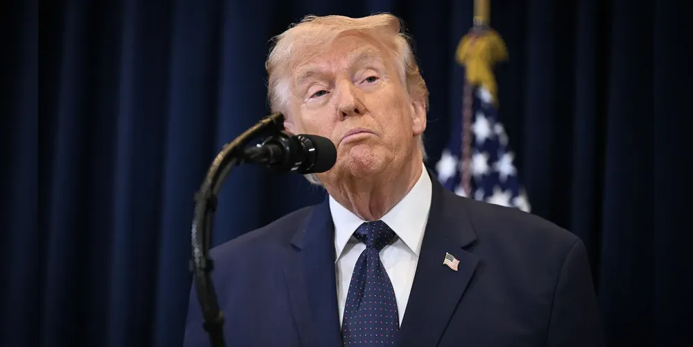 O presidente dos EUA, Donald Trump, durante coletiva de imprensa na Flórida nesta segunda-feira (9) • Roberto Schmidt/Getty Images