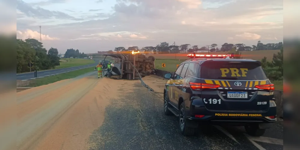 Uma carreta carregada com grãos de soja tombou no fim da tarde deste sábado (25), no km 454 da BR-376, em Ponta Grossa, no sentido Curitiba. O acidente ocorreu por volta das 18h, nas proximidades da cervejaria Ambev e resultou na interdição total da pista.